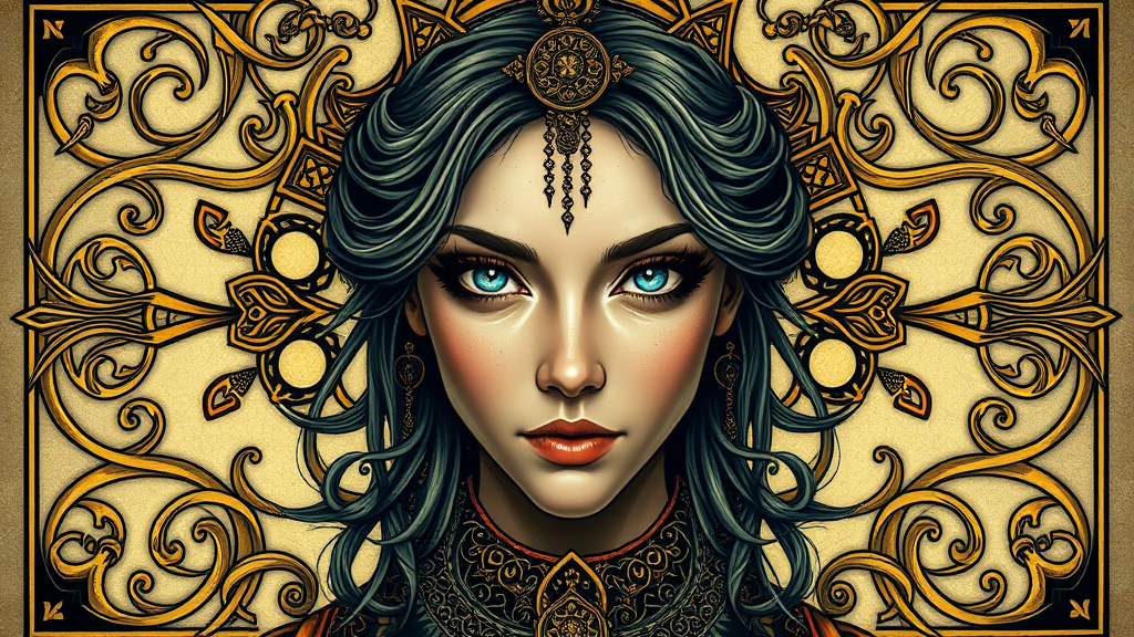Award-winning illustration, ultra-realistic tarot card, ornate Celtic art nouveau, symmetrical, backlit, 16k, UHD, HDR, featuring an intriguing protagonist with unique eyes and mysterious gaze, intricate detailing, harmonious color palette, graceful patterns, emphasizing mysticism and elegance while avoiding unnecessary distortions or artifacts, capturing ethereal beauty, seamless composition without textual interruptions or branding elements, perfect framing and proportion.