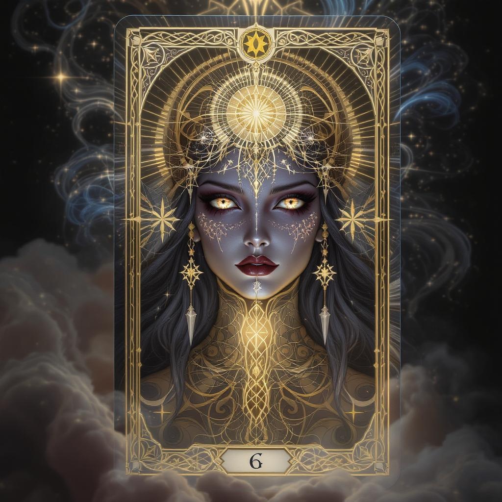 Award-winning illustration, ultra-realistic tarot card, featuring ornate Celtic and art nouveau elements, with symmetrical design. The scene is beautifully backlit, rendered in stunning 16k UHD HDR quality, creating a luminous and mystical atmosphere. The character portrayed has uniquely captivating features, with intriguing iris details and unusual pupil patterns, adding a touch of otherworldly allure. The artwork includes delicate ornamental designs, enhancing the mystical Celtic aesthetic. The detailed rendering avoids imperfections and irregularities, maintaining a polished appearance. The composition is focused and contained, ensuring all elements are harmoniously integrated within the frame, creating a seamless and immersive visual experience.
