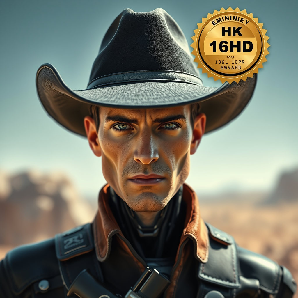 Award Winning Image of a Cyborg Cowboy, wearing a Black Cowboy Hat, Holstered Gun Belt, Rugged Handsome Features, Flawless Face, Blending Retro-Futuristic and Sci-Fi Elements on an Alien Planet, Highly Detailed, Cinematic Composition, Pixar and Disney Inspired Style, reminiscent of Alita and reelmech, Presented in 16k UHD HDR, eliminating defects such as cross-eyed features, multiple fingers, and mutated hands, ensuring clarity and perfection without cropping, maintaining a high-resolution quality free from artifacts, watermarks, or signatures, capturing a captivating singular view with a proportionate neck, seamlessly in frame, enhancing the imaginative narrative while keeping the essence intact.
