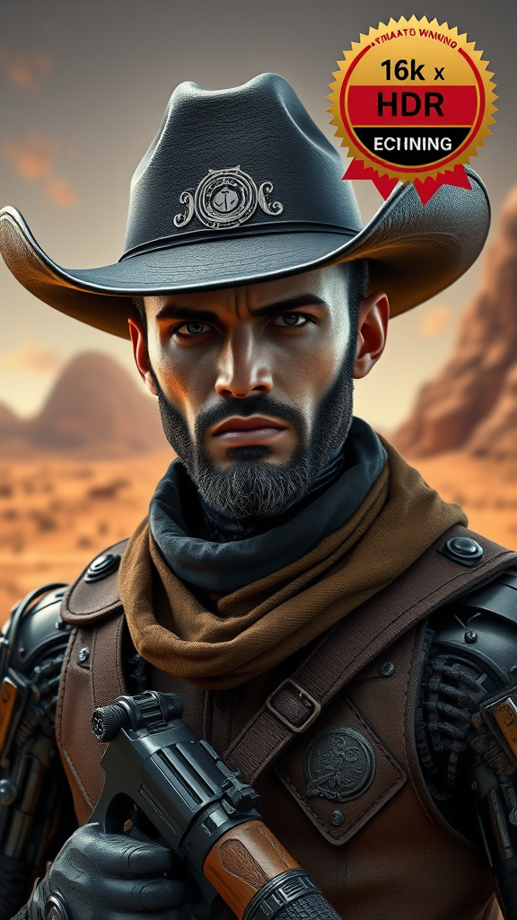 Award-winning image of a cyborg cowboy with a black cowboy hat and a gun belt, showcasing rugged features and a flawless face. The setting is an alien planet with retro-futuristic details in a sci-fi genre. The composition is cinematic, inspired by Pixar, Disney, and Alita, emphasizing extreme detail in a 16k HDR resolution. The character has a perfectly balanced appearance with no visual anomalies, maintaining a clean, high-quality image without text, artifacts, or distractions. The focus remains on the perfect blend of mechanical and organic elements in the design.