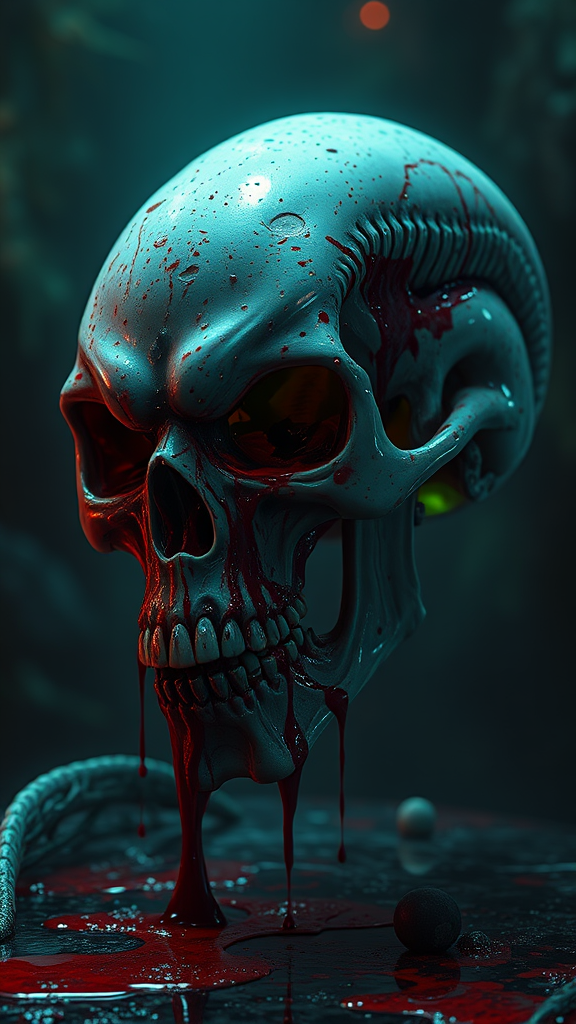 Award-winning image of a hyperrealistic alien skull drenched in a mixture of blood and corrosive acid, 8k resolution, enhanced with octane render, dramatic cinematic lighting, gaining traction on artstation, inspired by Giger's aesthetic, featuring intricate bone textures and eerie bioluminescent highlights, set against a dark, mysterious backdrop with hints of alien vegetation --ar 3:2.