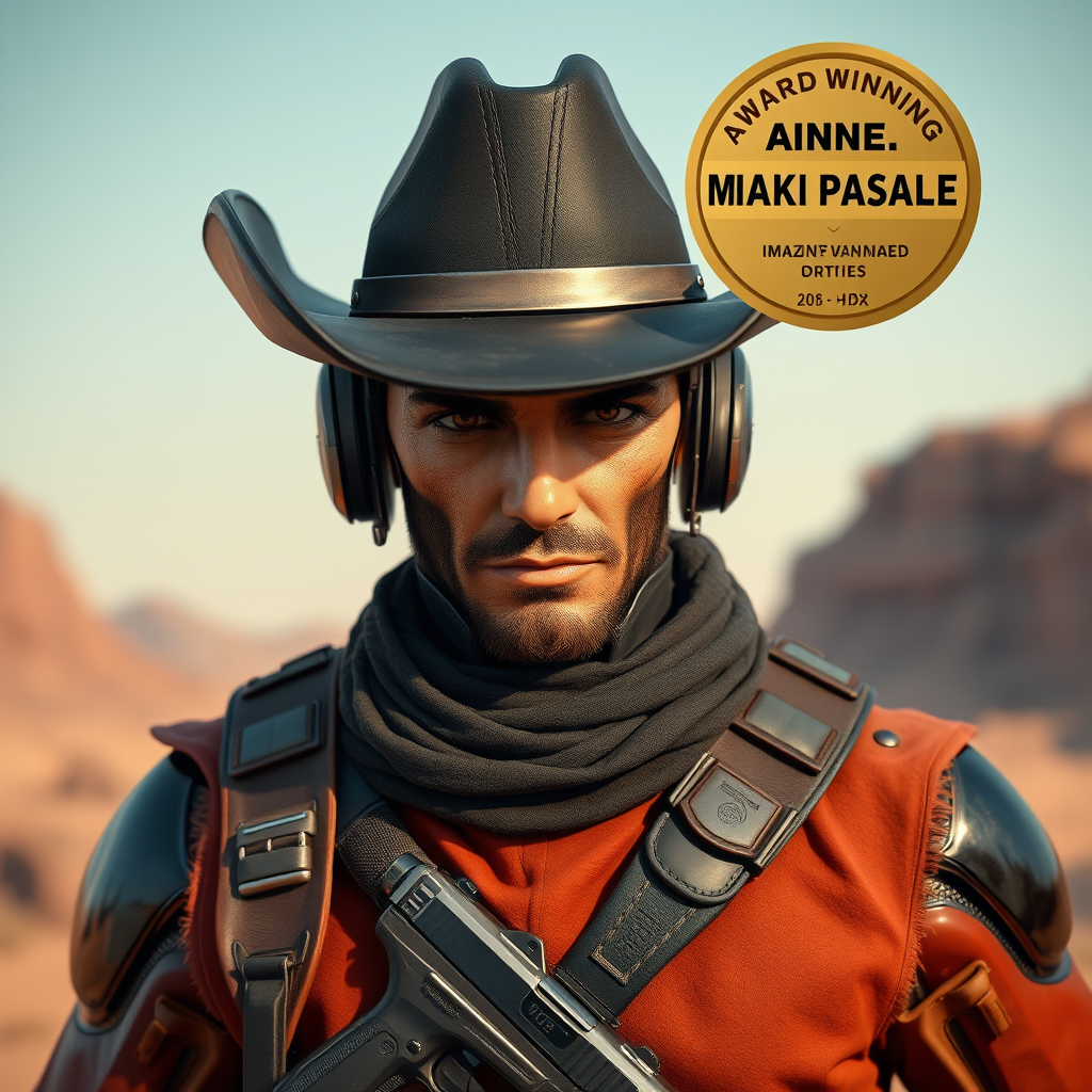Award Winning Photo of a Cyborg Cowboy with a Black Cowboy Hat and Gun Belt, showcasing Rugged Features and a Perfect Face in a Retro-Futuristic Sci-Fi style set on an Alien Planet, featuring Extreme Detail and Cinematic Composition, inspired by Pixar and Disney aesthetics with elements of Alita and reelmech, captured in 16k UHD HDR for vivid imagery. The image focuses on clarity and artistry, avoiding clones, cross eyes, and extra limbs while maintaining a well-composed and high-resolution finish without any signature, watermark, or text interruptions.