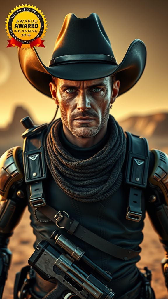Award-Winning Photograph of a Cyborg Cowboy, featuring a Black Cowboy Hat and Gun Belt, showcasing Rugged Features with a Perfect Face. The imagery blends Retro-Futuristic style with Sci-Fi elements on an Alien Planet, emphasizing Extreme Detail and Cinematic Composition. Inspired by the visual styles of Pixar, Disney, Alita, and reelmech, in 16k UHD HDR quality. The scene captures the essence of a futuristic world while highlighting intricate design elements, avoiding any visual noise or distortions like extra appendages, text artifacts, or framing issues, delivering a high-quality, immersive experience.