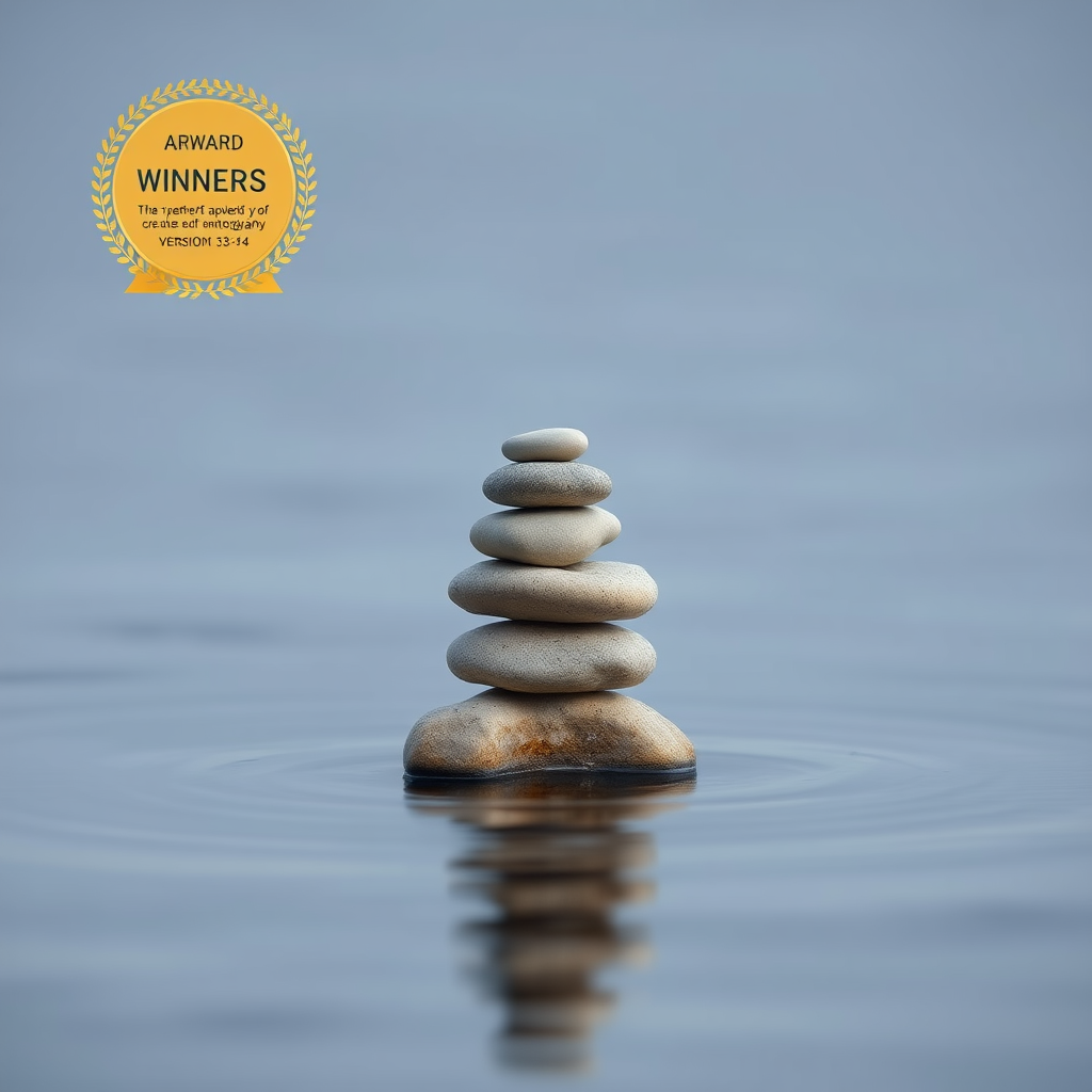 Award-winning photograph of delicately stacked stones on a serene water surface, minimalist composition, extended exposure time, muted color palette, captured with an 85mm lens, aspect ratio 3:4, version 5.