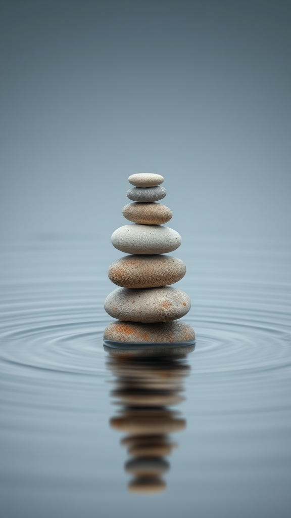 Award-winning photograph of stones stacked impeccably in serene water, minimalist composition, extended exposure, muted tones, captured with an 85mm lens aspect ratio 4:5 version 5.
