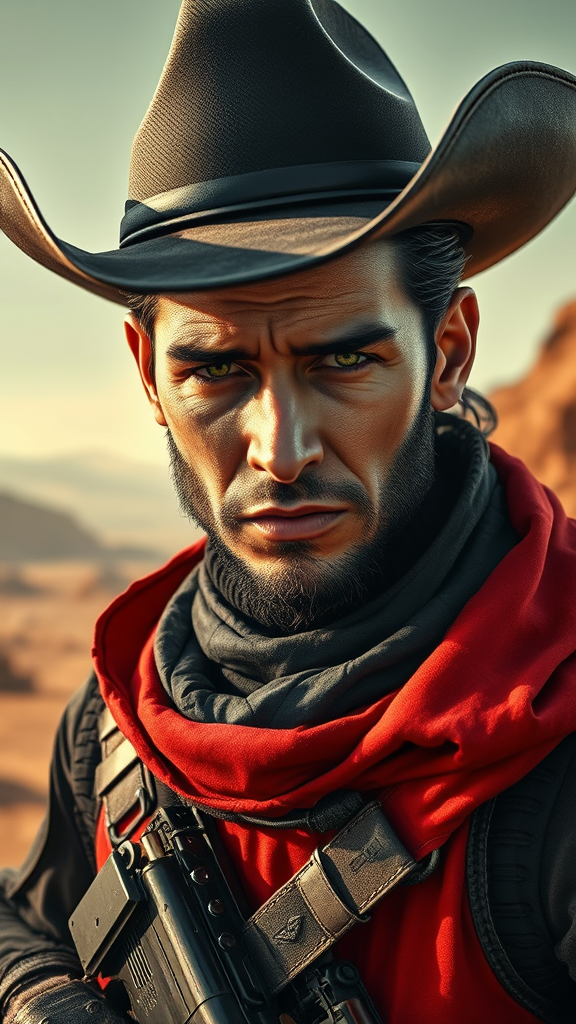 Award Winning Portrait of a Cyborg Cowboy, Donning a Black Cowboy Hat, Equipped with Gun Belt, Exhibiting Rugged Features, Flawless Face, Blending Retro-Futuristic Elements, Sci-Fi Aesthetic on an Alien Planet, Intricate Detailing, Cinematic Framing reminiscent of Pixar and Disney Style, Alita-esque, reelmech Influence, Presented in 16k UHD with HDR Quality, Capturing a Unique Essence without Imperfections such as Cloned Features or Distorted Anatomy, Maintaining Focus with High-Resolution Clarity.
