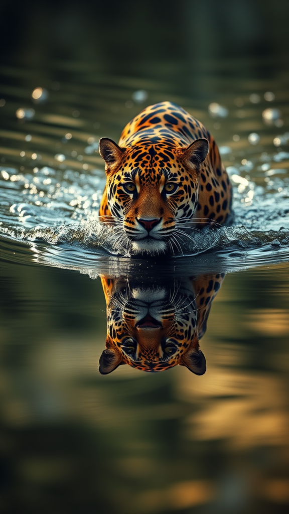 Award-winning portrait of a majestic jaguar gracefully traversing a shimmering water surface, capturing its own reflection; enhanced by cinematic lighting that highlights its elegant features. Utilizing the golden ratio, the composition is flawless, exuding detailed mastery with ultra-high resolution 4k clarity. The scene is enriched by a sharp focus, creating a perfect masterpiece that exudes elegance, illuminated by subtle backlight and enhanced HDR effects, conveying a sense of serenity and strength.