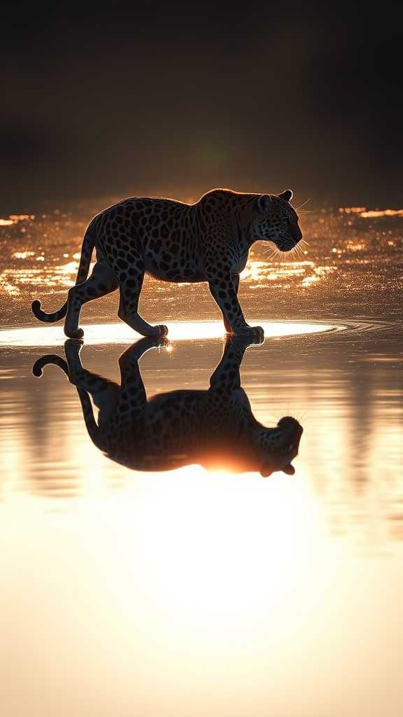 Award-winning portrait of a majestic jaguar striding gracefully across a shimmering water surface, eyes locked on its own reflection. Captured in ultra high resolution with exquisite detail, the scene boasts cinematic lighting that highlights the jaguar's elegant form. The composition follows the golden ratio, offering perfect balance and harmony. The backlight casts a dramatic silhouette, while HDR techniques enhance the depth and vibrancy of colors. This masterpiece, conceived with the precision of CinemaHelper and PhotoHelper, captures the wild beauty with razor-sharp focus in 4k—a testament to the artistry of nature.