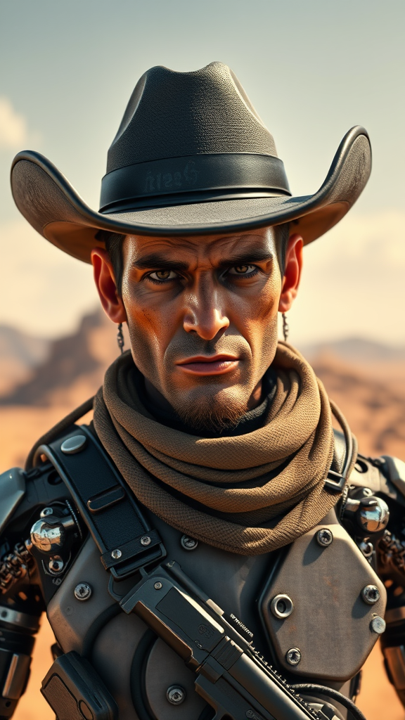 Award-winning portrayal of a Cyborg Cowboy with a black cowboy hat and gun belt, featuring rugged yet perfectly crafted facial features. Set on an alien planet, the character embraces a retro-futuristic style beautifully blending sci-fi elements. The scene captures extreme detail in a cinematic composition reminiscent of Pixar and Disney influences, akin to "Alita" and reelmech aesthetics. Rendered in stunning 16k UHD with HDR quality, ensuring a hyper-realistic representation. The cowboy's design maintains human-like qualities with a unique technological flair, avoiding any cloned or distorted features. Every aspect of the image is meticulously crafted to avoid cropping, low resolution, or any form of artifacts, ensuring a pure, high-quality visual.