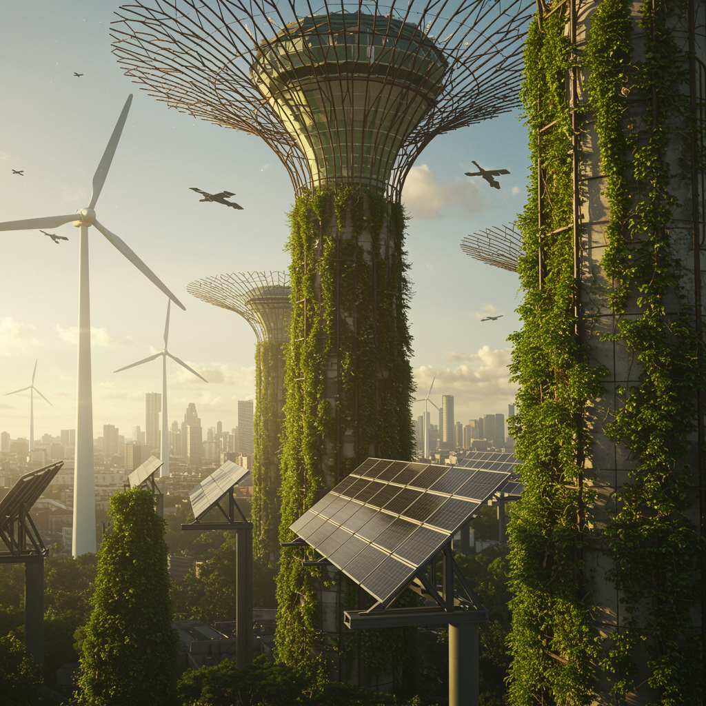 Award-winning portrayal of a solarpunk cityscape featuring towering vertical gardens with golden sunlight diffusing through advanced solar panels, showcasing an ecologically sustainable vision. The scene includes intricately detailed wind turbines against a dynamic city backdrop, embodying visionary futurism akin to the style of Hayao Miyazaki. Captured with a Nikon D850, using a film stock aesthetic and an f1.6 lens, the image is characterized by rich colors, hyper-realistic elements, and lifelike textures. It features dramatic lighting and vibrant contrast, reminiscent of Cinestill 800 film, with an emphasis on brightness. The composition is artistically crafted, avoiding common pitfalls such as low resolution, text errors, anatomical inaccuracies, or digital artifacts.