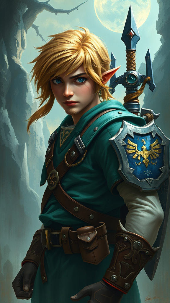 Award-winning poster of Link from Legend of Zelda, featuring one heroic figure in a fantasy ambiance. The composition captures Link in a model-shoot style, rendered as a professional, majestic oil painting inspired by Ed Blinkey, Atey Ghailan, and Studio Ghibli, with the artistic flair of Jeremy Mann, Greg Manchess, and Antonio Moro. This piece is trending on ArtStation and CGSociety for its intricate high detail and sharp focus. The painting is dramatic and photorealistic, crafted with the skill of Midjourney and Greg Rutkowski. Link is depicted with heroic equipment, exuding a rugged charm with subtle facial hair, embodying strength and courage. The background imbues a mythical atmosphere, enhancing the sense of adventure and mystery.