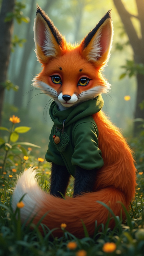 Award-winning RAW color photograph of a stunning digital creation featuring a beautiful, fully-clothed fox with intricately detailed ears and tail, amidst a verdant fantasy forest setting. The scene evokes a D&D atmosphere, showcasing high contrast with backlighting and a touch of bloom. A hint of chromatic aberration adds depth, while maintaining a smooth, sharp focus. Captured on a state-of-the-art mirrorless camera, this masterpiece embodies photorealism with intricate details in 8k resolution and HDR quality. The image is brought to life with light sparkles illuminating the scene.