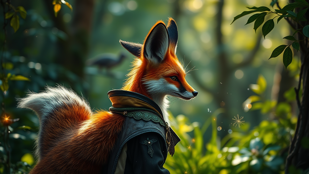 award-winning RAW color photograph of a stunningly detailed fox character with exquisitely intricate ears and tail, adorned in elegant attire, set in a verdant fantasy woodland. The scene exudes a D&D ambiance with heightened contrast, captivating backlighting, and a gentle bloom effect. Elements of chromatic aberration enhance the image's depth, while maintaining a smooth and sharply focused presentation. Captured on a high-end mirrorless camera, this masterpiece embodies photorealism at its peak, rendered in exceptional 8k HDR quality with enchanting light sparkles throughout the lush environment.