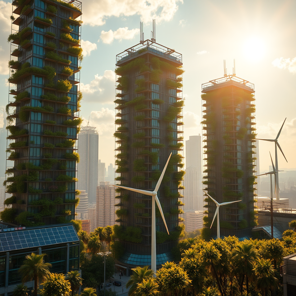 Award-winning representation of a solarpunk cityscape featuring towering vertical gardens, golden sunlight streaming through state-of-the-art solar panels, and showcasing ecologically sustainable practices. The scene includes detailed wind turbines against a futuristic city backdrop, inspired by visionary futurism with a nod to Hayao Miyazaki's style. Captured with a Nikon D850 and a film-like quality reminiscent of f1.6 lens photography, the image boasts rich colors, hyper-realistic and lifelike textures, and dramatic lighting using Cinestill 800. The vibrant contrast creates a bright and dynamic atmosphere, highlighting the harmonious blend of nature and technology. Despite being in low resolution and featuring intentional image imperfections like jpeg artifacts, the artwork maintains its charm, focusing on the beauty and innovation of sustainable urban living without losing its imaginative essence or aesthetic integrity.