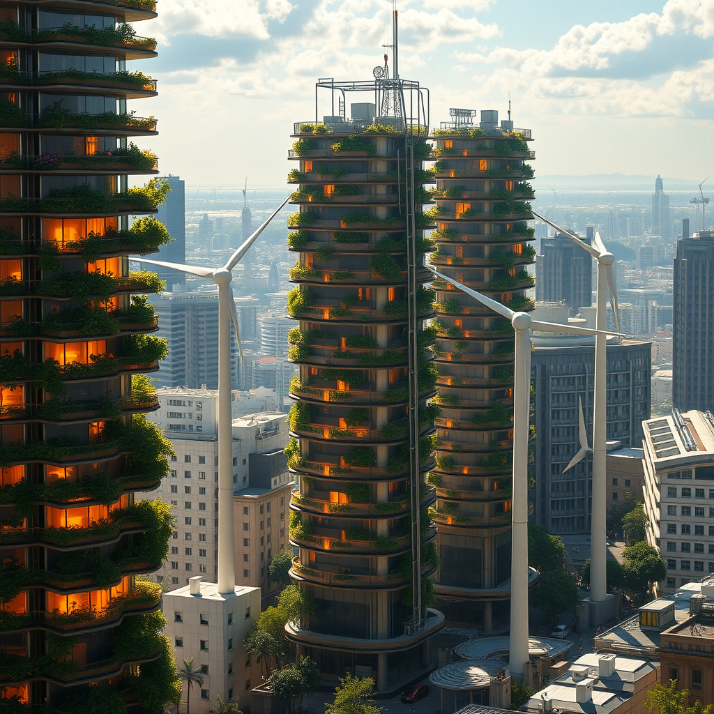 Award-winning representation of a solarpunk cityscape featuring towering vertical gardens with golden sunlight streaming through translucent solar panels, showcasing environmentally sustainable designs. Intricately detailed wind turbines stand elegantly against a vibrant city backdrop, embodying visionary futurism akin to Hayao Miyazaki's style. Captured with a Nikon D850, the film stock photograph utilizes an f1.6 lens, highlighting rich colors and hyper-realistic textures. The scene is illuminated by dramatic lighting with vibrant contrast, emulating the aesthetic of Cinestill 800 film for a bright yet intimate portrayal. The cityscape, rendered in low resolution, displays unique character amidst jpeg artifacts, enriching its artistic narrative. Despite elements of bad anatomy and art imperfections, such as disfigured or extra limbs, the depiction remains intriguing and surreal, embodying a sense of creative chaos. The composition incorporates elements that defy conventional beauty, emerging as an avant-garde masterpiece complete with watermarks and signature anomalies, offering a unique vision of a sustainable future.