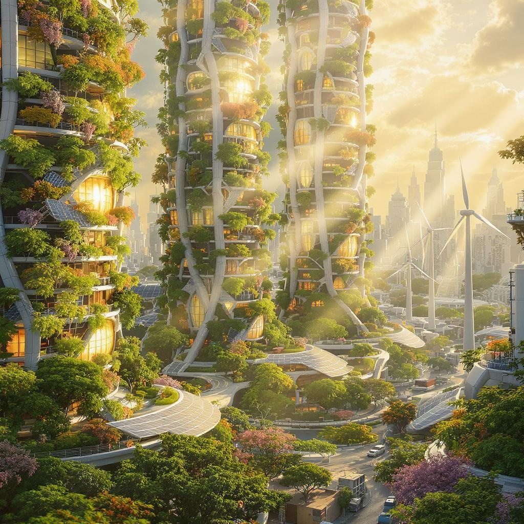 Award-winning representation of a solarpunk cityscape featuring towering vertical gardens with golden sunlight streaming through translucent solar panels. The environment showcases ecological sustainability with intricately designed wind turbines set against a dynamic city background. Embracing visionary futurism in the style of Hayao Miyazaki, captured with a Nikon D850 using a film stock photograph approach and an f1.6 lens. The scene is filled with rich colors, hyper-realistic details, and lifelike textures, enhanced by dramatic lighting akin to Cinestill 800 with vibrant contrast and brightness. Image challenges include low resolution, jpeg artifacts, and imperfect anatomy, capturing the complex beauty of a future-focused metropolis.