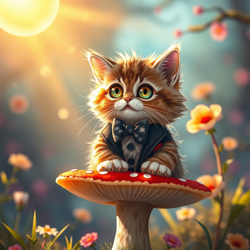 Award-winning splash art of a cute, fluffy cat wearing a suit and bowtie, perched on a magical toadstool. The cat has beautiful, captivating eyes and is bathed in warm sunlight, creating a serene and enchanting atmosphere. The background is vibrant and fantastical, reminiscent of popular art styles trending on ArtStation. The image boasts impeccable detail and clarity, with an emphasis on the whimsical and charming nature of the scene, ensuring a high-resolution and visually stunning representation.