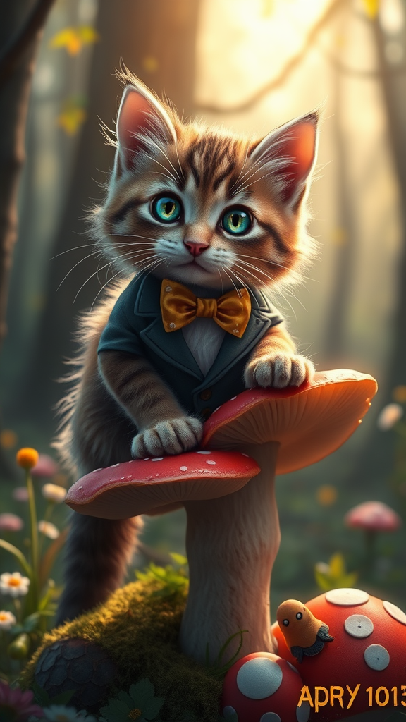Award-winning splash art of an adorable fluffy cat in a dapper suit and bowtie, gracefully perched on a magical toadstool in a whimsical forest setting. The cat's beautiful eyes glisten in the gentle sunlight, creating a captivating scene. Trending on ArtStation with impeccable detail and vibrant colors. Avoid extra limbs, distorted features, or any visual imperfections. Ensure high quality, clarity, and a single cohesive image without text, logos, or artifacts. Maintain an artistic and realistic style with a touch of fantasy charm.