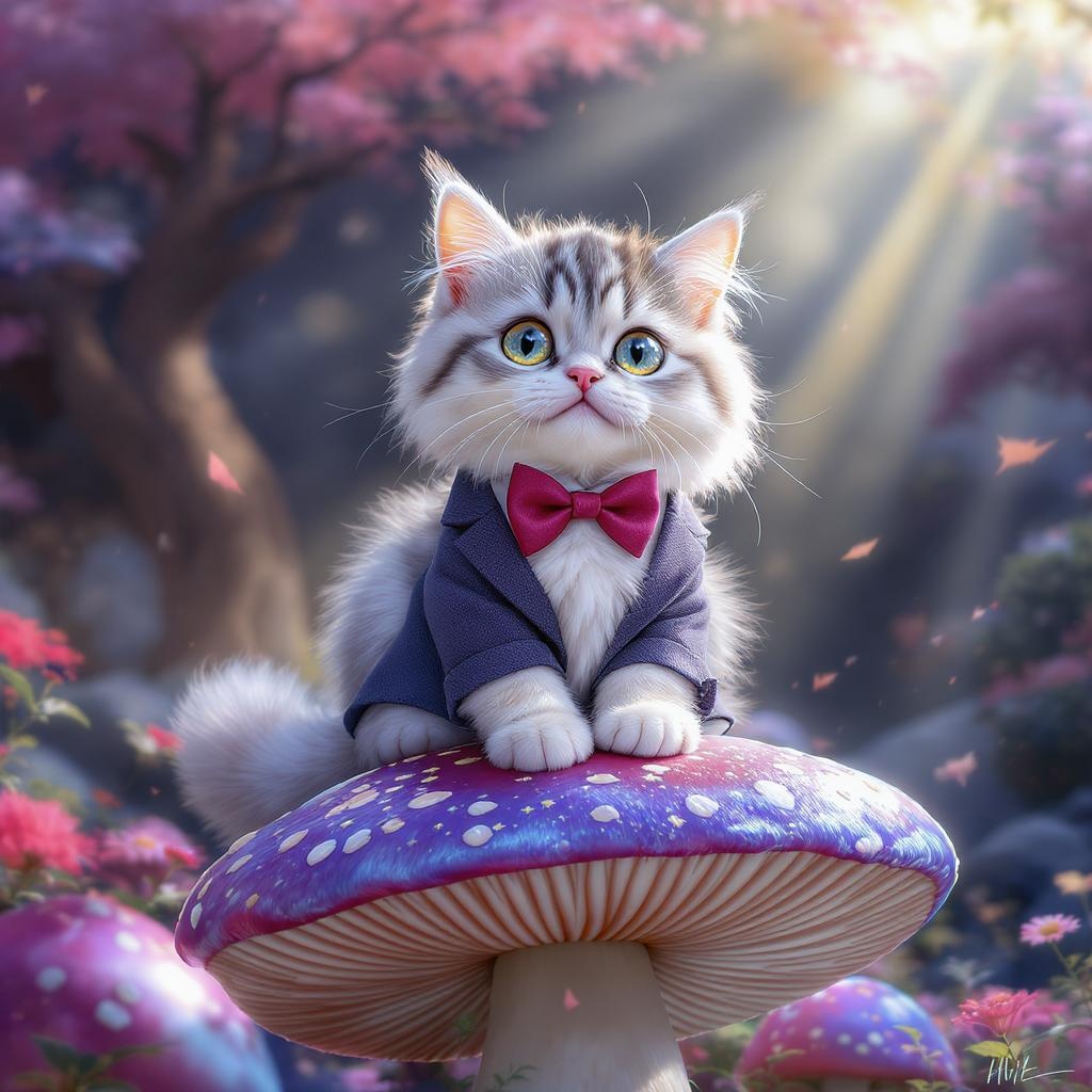 Award-winning splash art of an adorable fluffy cat dressed in a suit and bowtie, perched on a magical toadstool. The cat has enchanting, beautiful eyes glistening in the sunlight, creating a whimsical atmosphere. The scene radiates a charm that could trend on art platforms, combining elements of fantasy and elegance. The focus is on high-resolution detail, capturing the catβs fluff and the toadstool's vibrant colors, avoiding any distortions or imperfections such as extra limbs, cloning effects, or poor image quality. The background seamlessly complements the subject, ensuring the artwork remains pristine and captivating without intrusive elements like watermarks, text, or blurriness.