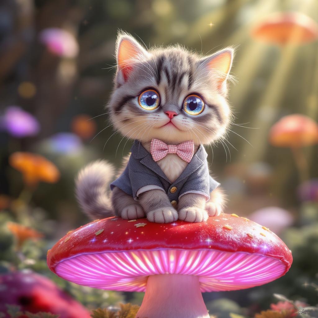 Award-winning splash art of an adorable fluffy cat dressed in a suit and bowtie perched on a magical toadstool, featuring mesmerizing eyes glimmering in sunlight. This captivating scene is trending on ArtStation and features extraordinary detail and resolution, capturing the whimsical charm and enchanting atmosphere. The artwork is free of any visual or thematic imperfections such as extra limbs, distorted proportions, or visual artifacts, maintaining a high standard of artistic quality without text, logos, or any signs of digital degradation, ensuring a polished and visually stunning presentation.