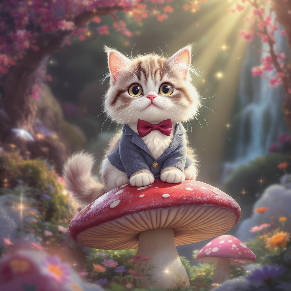 Award-winning splash art of an adorable fluffy cat dressed in a suit and bowtie, perched on a magical toadstool, surrounded by enchanting sunlight. The cat has beautiful, expressive eyes and the setting is reminiscent of a trending piece on ArtStation. Avoid extra limbs or mutated features, ensuring proportions are harmonious and aesthetically pleasing. The scene should be clear, high quality, and entirely free of any text, logos, or visual artifacts, capturing a dreamy and whimsical atmosphere.
