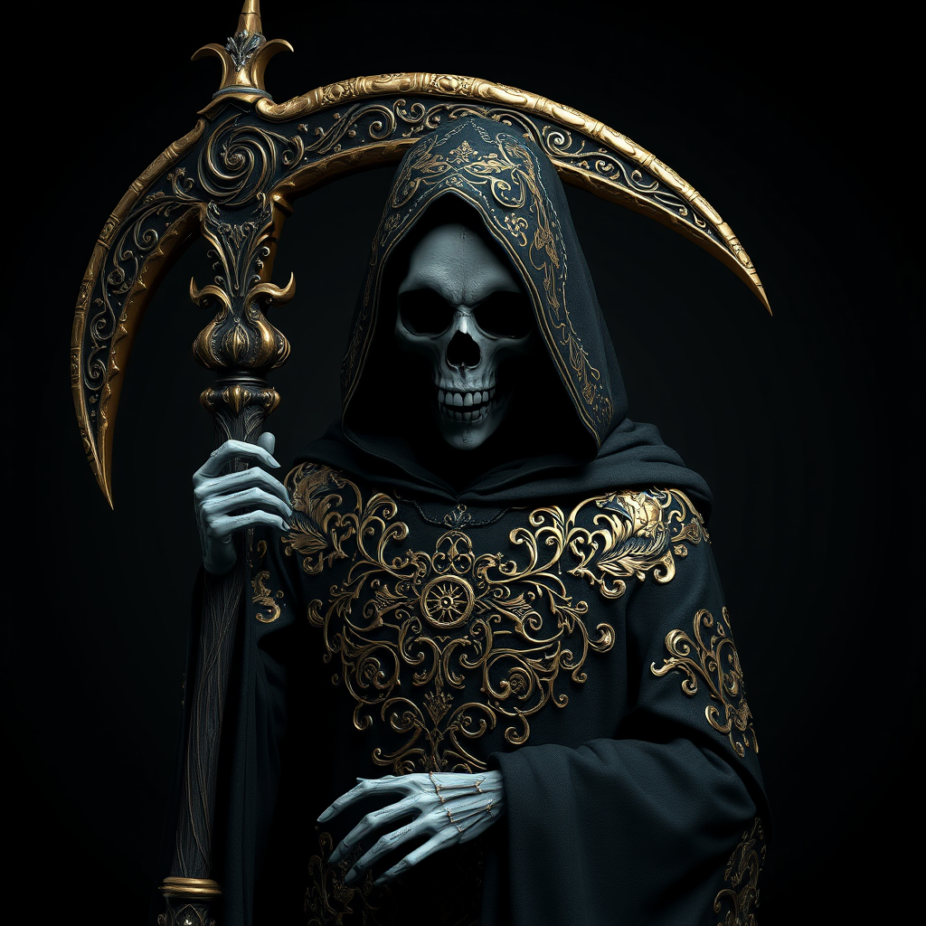 Award-winning studio photo concept depicting the Grim Reaper adorned in intricate golden filigree, set in a low key, high contrast environment; features elements resembling a ZBrush nrealfixer creation with CGI aesthetics, blending hyper-realistic render qualities with illustration-like surrealism, capturing a hauntingly beautiful, otherworldly presence.