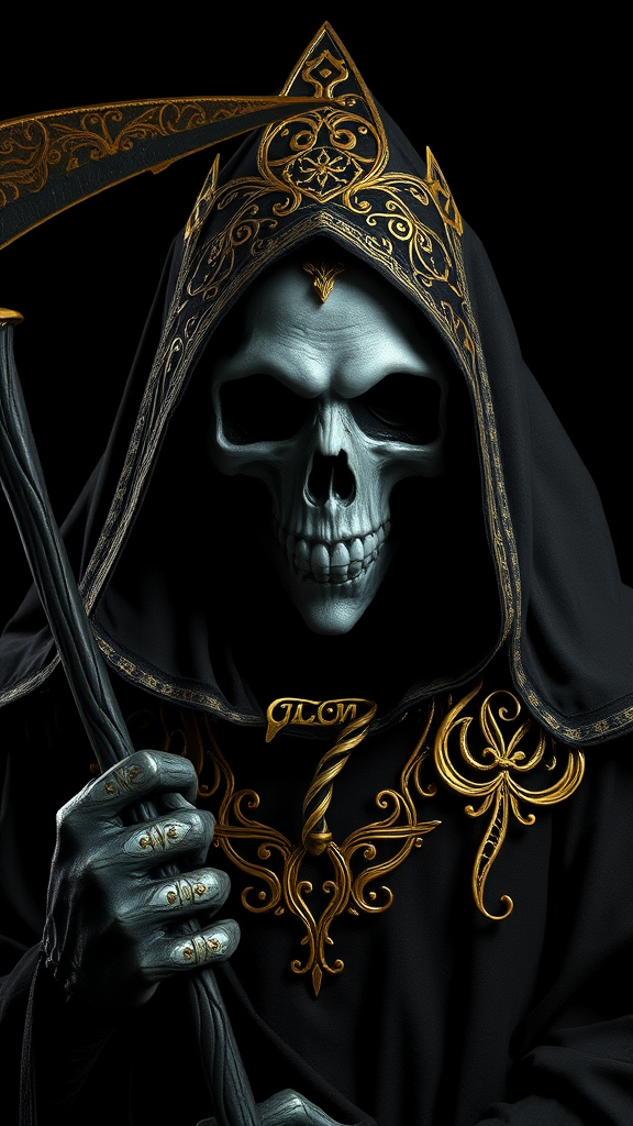 Award-winning studio portrait of the Grim Reaper adorned in intricate golden filigree, characterized by a low key and high contrast aesthetic. The composition incorporates elements of zbrush artistry, blending nrealfixer and nfixer techniques to create a striking CGI render that blurs the lines between painting and digital illustration. Subtle creative enhancements emphasize the dark elegance of the scene.