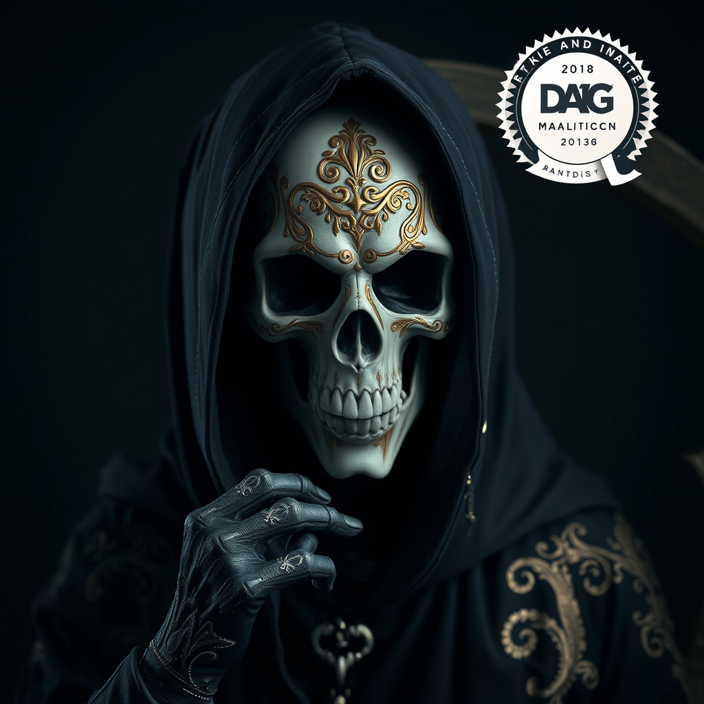 Award winning studio portrait of the grim reaper adorned with intricate golden filigree, presented in a low key, high contrast setting, blending elements of zbrush artistry with surreal nrealfixer finesse, rendered with CGI precision into a realistic yet imaginative illustration that blurs the line between fake and fantastical painting.