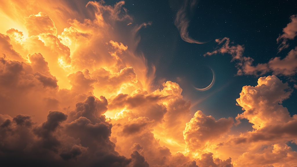 Awe-inspiring sky teeming with clouds, vivid tendrils of fire and ethereal wraiths dancing across the heavens, a metallic nebula providing a cosmic backdrop, invoking a profound sense of wonder.