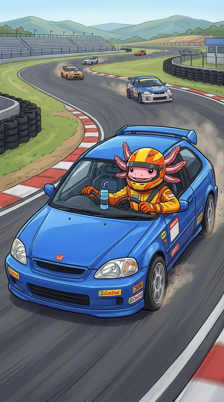 A cheerful axolotl in a racing suit and helmet drives a blue Honda Civic on a winding racetrack. Other cars are visible in the background, creating a dynamic and fun racing scene.