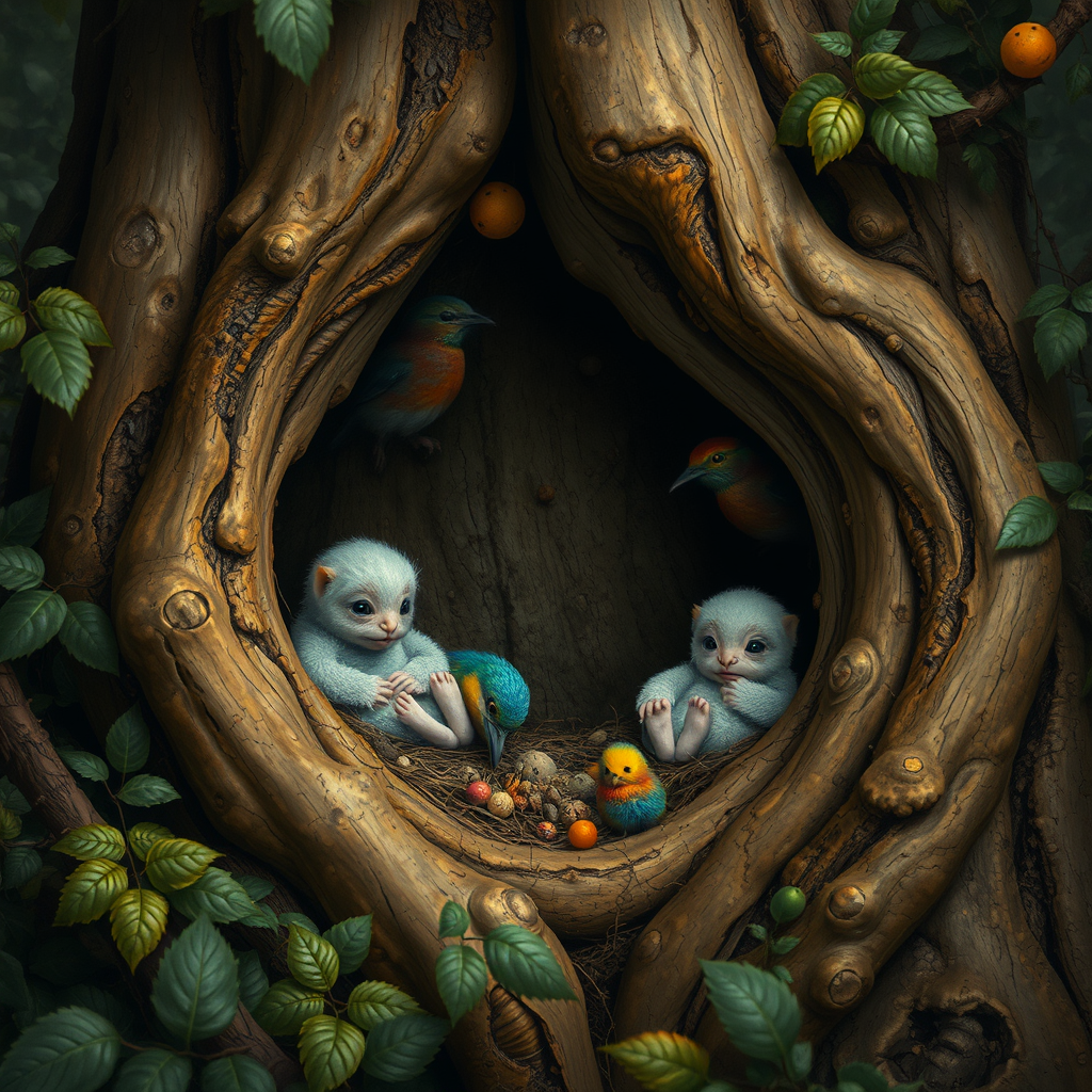 Babies nestled in the hollows of ancient forest trees, each nook teeming with vibrant avian-themed elements. Hyperrealistic portrayal reminiscent of detailed wildlife portraits, inspired by the intricate works of Stephen Shortridge, Lilia Alvarado, and Bob Eggleton. Lush foliage frames the scene, capturing the essence of raw, untouched nature studies. The babies, akin to young forest creatures, are cocooned in silent moments of wonder and awe. The setting resonates with a vivid palette, encapsulating the mystique of nature's intimate embrace, with layers of textures highlighting the serene immersion into the wildlife tableau.