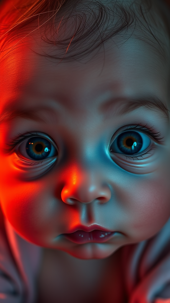 Baby, adorable, detailed digital portrait, vibrant and high-definition, capturing dynamic lighting and intricate features. The image highlights the baby's huge, expressive eyes, drawing inspiration from a colorful, weirdcore aesthetic. The picture employs ultra-high-definition techniques such as UHD, HDR10, and 16K, ensuring a crisp and vivid portrayal. It conveys a sense of wonder mixed with an element of the surreal, blending a touch of LED-inspired brightness with an undercurrent of subtle horror, creating a fascinating and unusual visual experience.