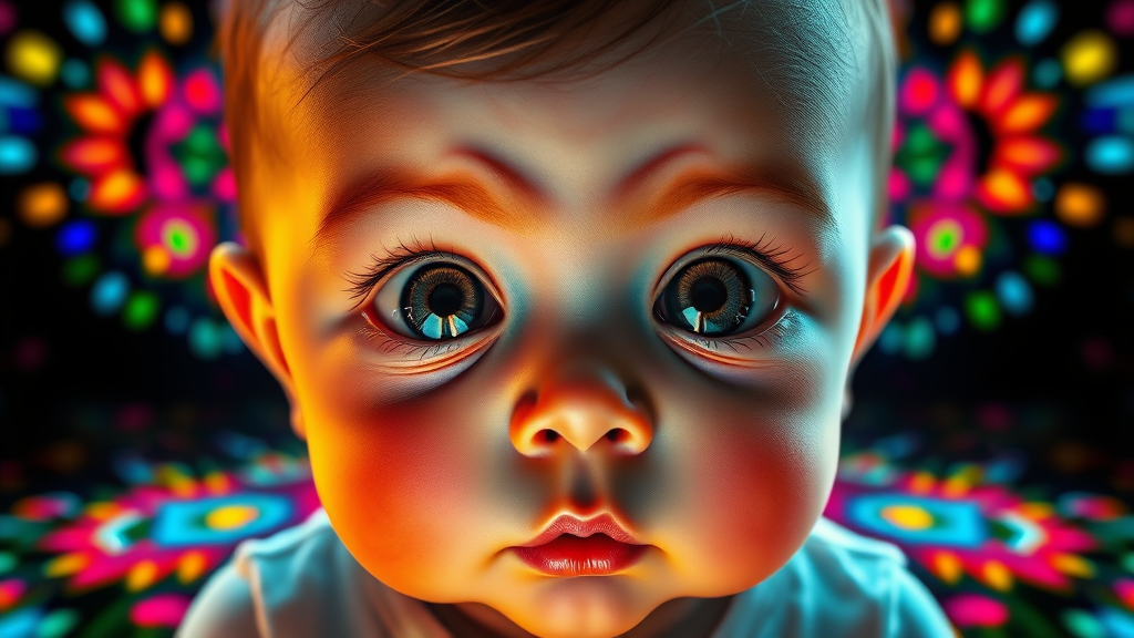 Baby, adorable, HD, vibrant, digital portrait, dynamic lighting, intricate, ultra-detailed large eyes, big eye, weirdcore, LED, shocked, UHD, HDR10, 16K, absurd resolution, surreal, peculiar, vivid imagery, imaginative, artistic expression, distorted reflections, unique textures, exaggerated features, fantastical, ethereal, kaleidoscopic backdrop, playful essence, charming yet unsettling, visually captivating, lush colors, distinctive style, dreamlike quality.