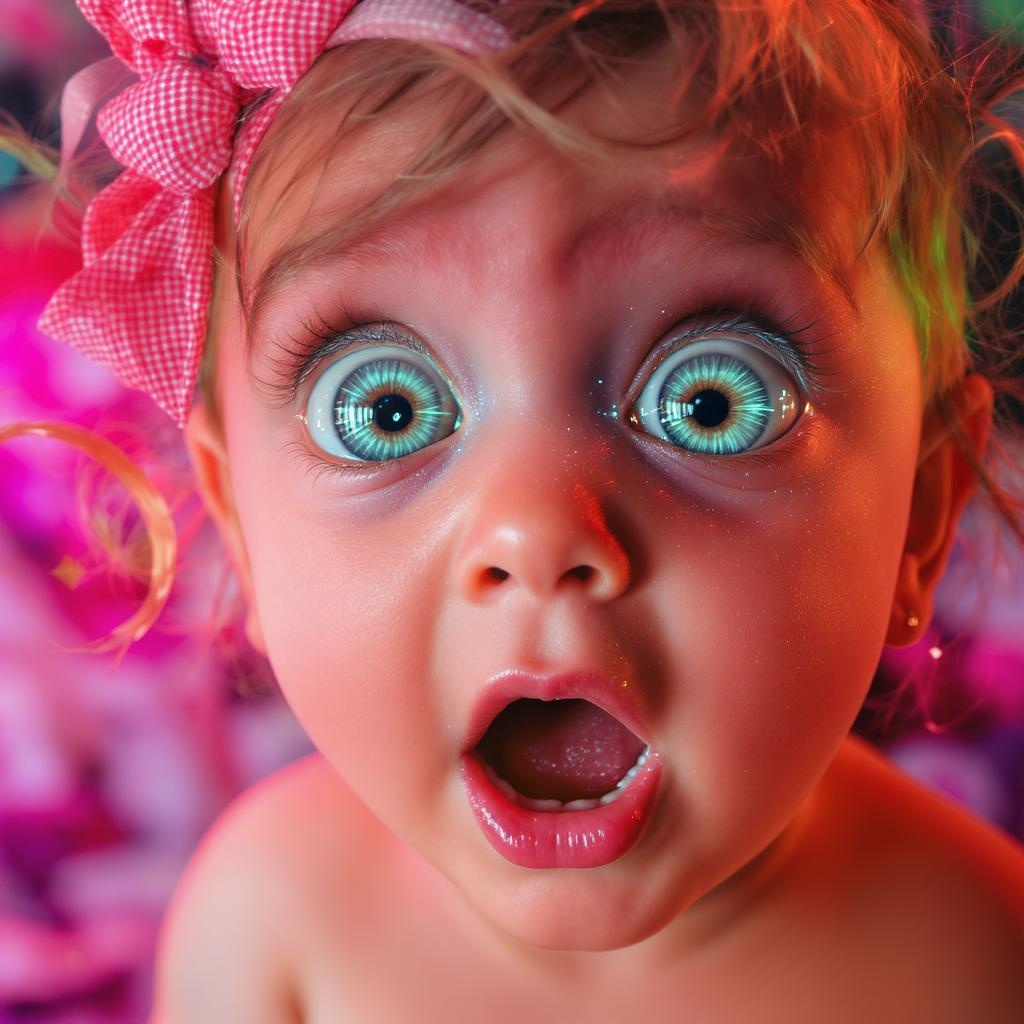 Baby, adorable, HD, vibrant, digital portrait, dynamic lighting, intricate details, ultra detailed huge eyes, unique style, weirdcore, LED effects, shocked expression, UHD, HDR10, 16K, vivid colors, surreal elements, imaginative background, expressive face, charming oddity, fantastical nuances.