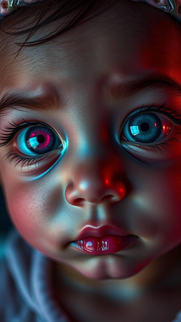 Baby, HD, colorful digital portrait, dynamic lighting, intricate, ultra detailed, oversized expressive eyes, weirdcore elements, vibrant LED-inspired hues, surreal expression, UHD, 16K resolution. Model: Dark Sushi Mix – seamlessly integrated, surreal mix of features, slight artistic distortion for effect, abstract yet coherent eye shapes, subtle facial asymmetry, elongated subtle textures, elegantly altered composition, enhanced vividness, ethereal ambiance, cohesive expression, immersive and captivating visual narrative.