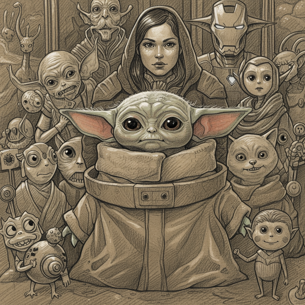 Baby Yoda, cbzbb-inspired, intricately detailed, magical fantasy realm, dreamlike and surreal, irresistibly cute, trending on ArtStation, pencil sketch style, imperfect photo, abstract drawing, whimsical cartoon elements, diverse group of characters including a woman, man, and otherworldly beings, superhero essence, Iron Man influence, adorable baby, anime-inspired aesthetics.