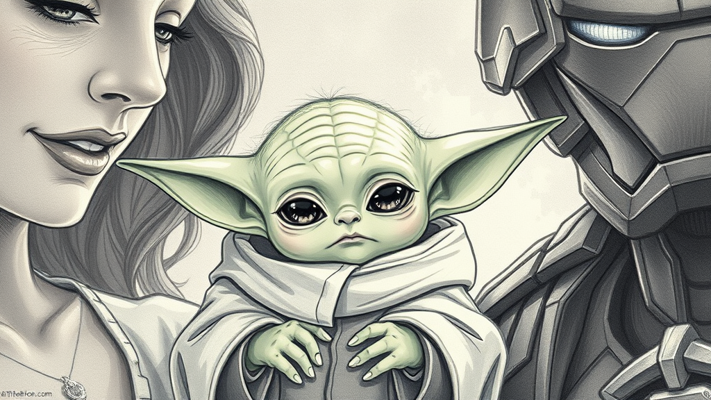 Baby Yoda, cbzbb, intricately detailed, enchanting fantasy, dreamlike and surreal, irresistibly cute, artstation trending pencil sketch, flawed photograph allure, imperfect drawing charm, whimsical cartoon essence, woman, man, intriguing characters, super hero allure, Iron Man twist, adorable infant charm, anime-inspired adventure whimsy.
