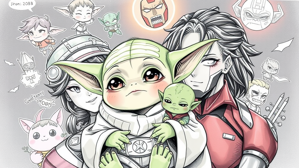 Baby Yoda, cbzbb, intricately detailed, enchanting fantasy, dreamlike surrealism, adorably endearing, popular on artstation pencil sketch, whimsical illustration, playful cartoon, woman, man, diverse characters, superhero elements, Iron Man meets Baby, anime charm, vibrant ensemble of fantastical personas.