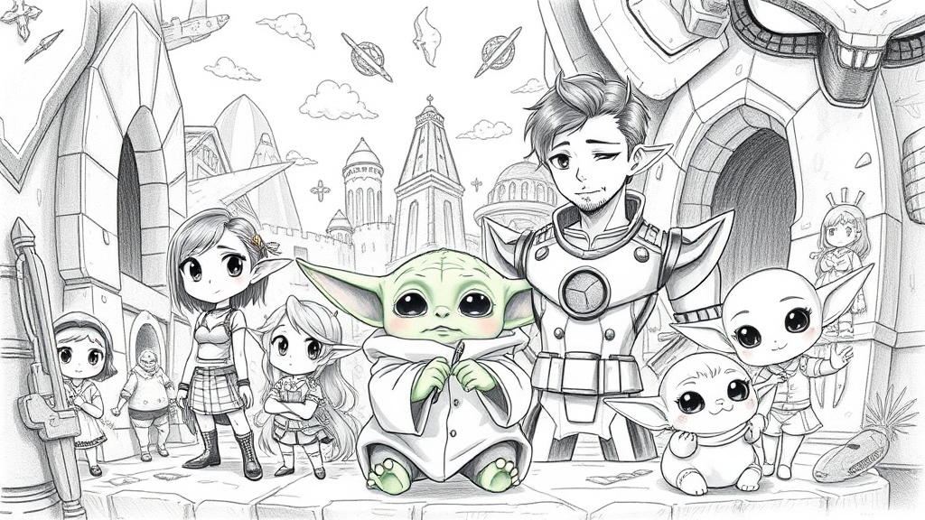 Baby Yoda in a detailed, fantasy dreamscape, infused with surrealism, blending super cuteness with a whimsical touch, resembling trending art styles on ArtStation. This pencil-drawn scene includes charming cartoon characters alongside a heroic figure reminiscent of Iron Man, all illustrated with an anime flair. Amidst this imaginative world, there's a woman and man, each portrayed as distinct, playful characters, mingling with other endearing personalities. The artistry evokes the essence of a dreamlike adventure, mixing realism with the humorous feel of a misplaced, quirky photo.
