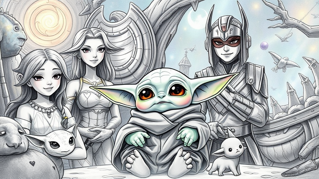 Baby Yoda in a dreamlike fantasy setting, with detailed surrealism, super cute and cartoonish. A gathering of unique characters including a gentle woman and a heroic man, resembling anime style superheroes. Vibrant and trending on ArtStation, the scene feels whimsical and ethereal, with Baby Yoda surrounded by fantastical creatures and environments. Despite its cuteness, the drawing maintains an intricate pencil sketch quality, blending anime with elements of fantasy and superhero genres, creating a captivating and imaginative tableau.