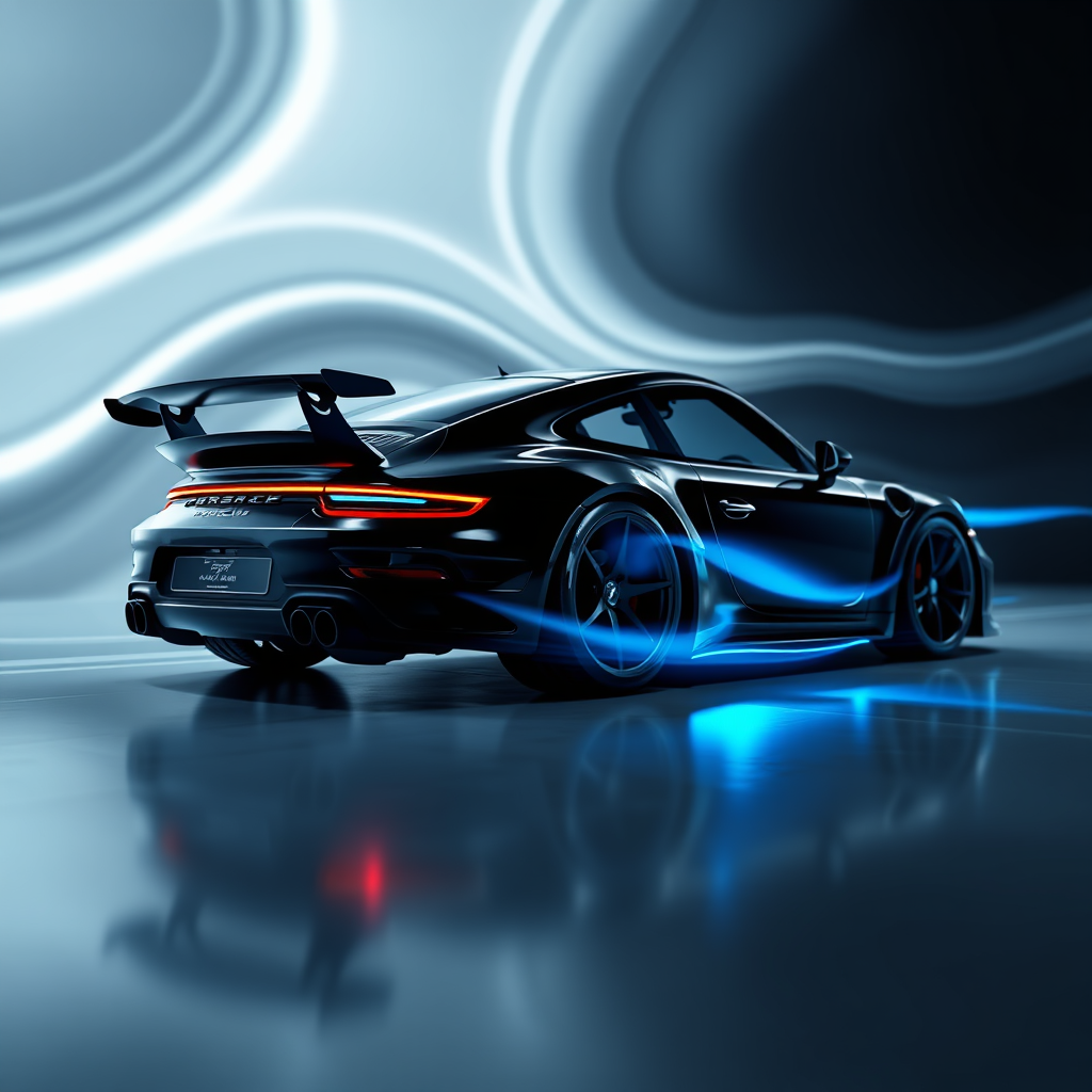 Backlit Porsche 911, featuring a palette of black, white, and blue; 3D abstract digital artwork with dynamic fluidity and sharp lines; depth of field, advanced shaders, and RTX technology; cinematic CGI with volumetric lighting; created using Octane Render for an immersive wallpaper experience; aspect ratio 16:9, with a focus on high quality and creative unpredictability.