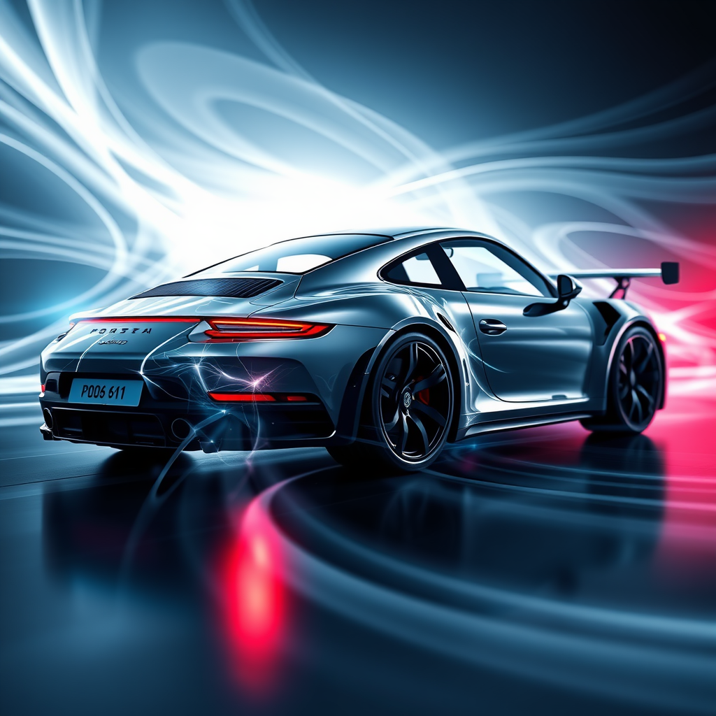 Backlit Porsche 911 in an abstract digital artwork rendered in 3D, featuring a blend of black, white, and blue hues. The piece showcases fluid yet sharp lines with enhanced depth of field and intricate shaders. Utilizing RTX technology for realistic CGI effects, the scene is illuminated by volumetric light, optimized in an octane render style. Designed as a dynamic wallpaper, it captures a sense of movement and energy with a touch of controlled chaos.