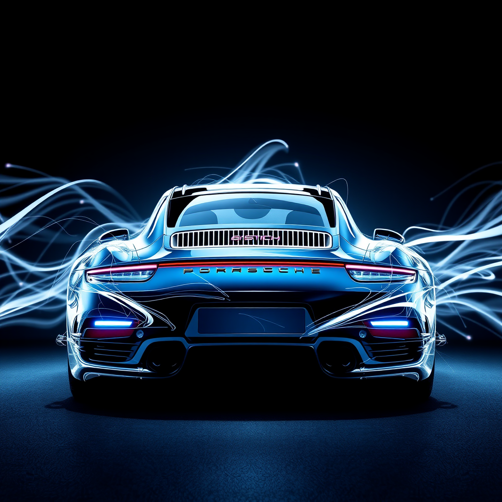 Backlit Porsche 911 in black, white, and blue tones, presented as a 3D abstract digital artwork featuring fluid and sharp lines, depth of field, advanced shaders, RTX and CGI effects, enhanced with volumetric light. Created using octane render for a striking wallpaper aesthetic with an aspect ratio of 16:9. Emphasizes dynamic motion and energy through a chaotic yet harmonious composition, set against a sleek, modern backdrop with a subtle variance in structure.