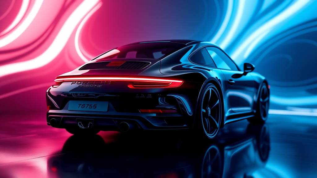 Backlit Porsche 911 in shades of black, white, and blue, featuring 3D abstract digital artwork with fluid and sharp lines. Depth of field and advanced shaders bring out the details, enhanced by RTX technology and CGI, with volumetric lighting through octane render. Designed as a visually stunning wallpaper, capturing the essence of a modern, dynamic aesthetic in a 16:9 aspect ratio, maintaining a balance of chaos and order with a slight creative twist.