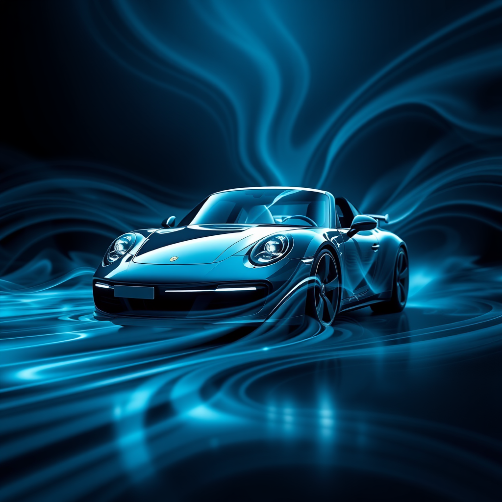 Backlit Porsche 911 with shades of black, white, and blue, featuring 3D abstract digital artwork with fluid sharp lines, depth of field, advanced shaders, RTX graphics, CGI elements, and striking volumetric lighting. Rendered using octane for high-quality wallpaper in a 16:9 aspect ratio, balancing creativity and chaos within a smooth, dynamic composition.
