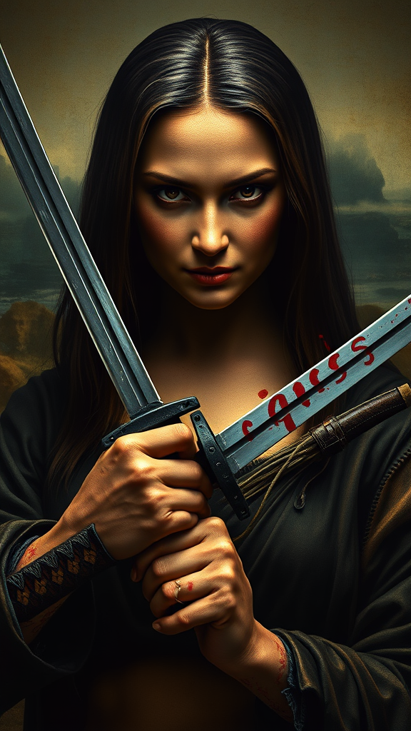 badass mona lisa envisioned through the lens of quentin tarantino, intense and realistic with meticulous detail, holding a katana with a fierce gaze fixed on the viewer, traces of blood accentuating the scene, cinematic style, vertical composition, suspenseful atmosphere