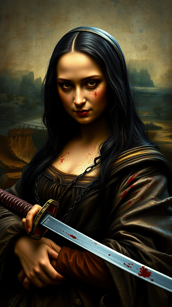 badass mona lisa inspired by quentin tarantino, gritty and cinematic, hyper-realistic, with intense detail, piercing gaze at the viewer, wielding a katana, traces of battle evident, dramatic lighting, blood-stained attire, tall and narrow composition, immersive atmosphere