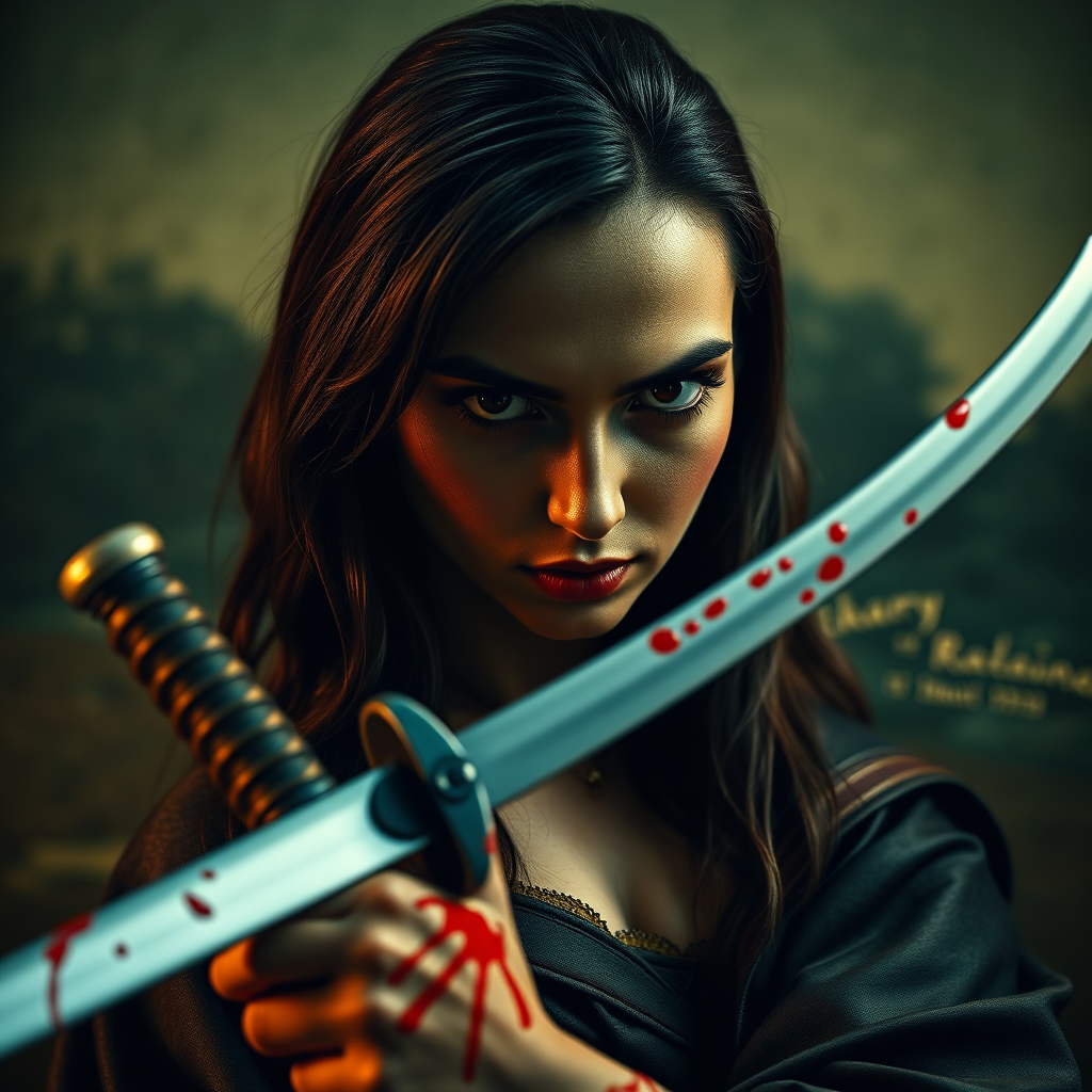 Badass Mona Lisa inspired by Quentin Tarantino's style, featuring cinematic and highly detailed visuals, gazing intensely at the camera. Armed with a katana in a dynamic pose, with splashes of blood adding intensity. Composition set in a dramatic 9:16 aspect ratio, exuding a gritty and realistic atmosphere.