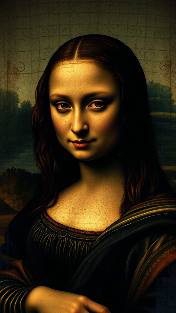 Badass Mona Lisa, reimagined through the lens of Tim Burton, cinematic and hyper-realistic details, intense gaze at the camera, infused with gothic and moody cinematic influences, dark and mysterious atmosphere, vertical composition, intricate shadows and textures, signature Burton-esque whimsy intertwined with classical elements.