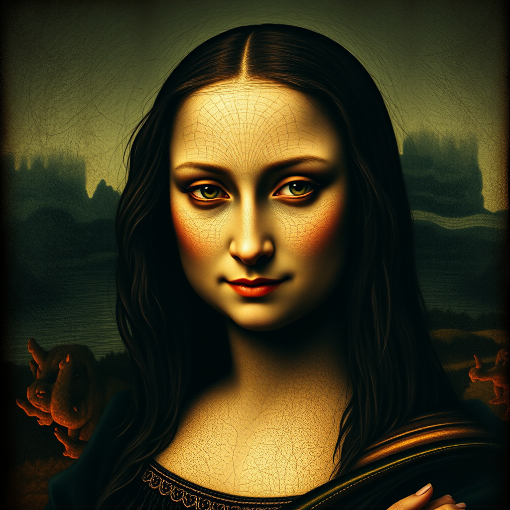 Badass Mona Lisa styled by Tim Burton, cinematic and realistic with intricate details, gazing intensely at the camera, infused with gothic and dark cinematic elements, atmospheric and enigmatic, elongated 9:16 aspect ratio with a slightly softened edge for dreamlike impact.